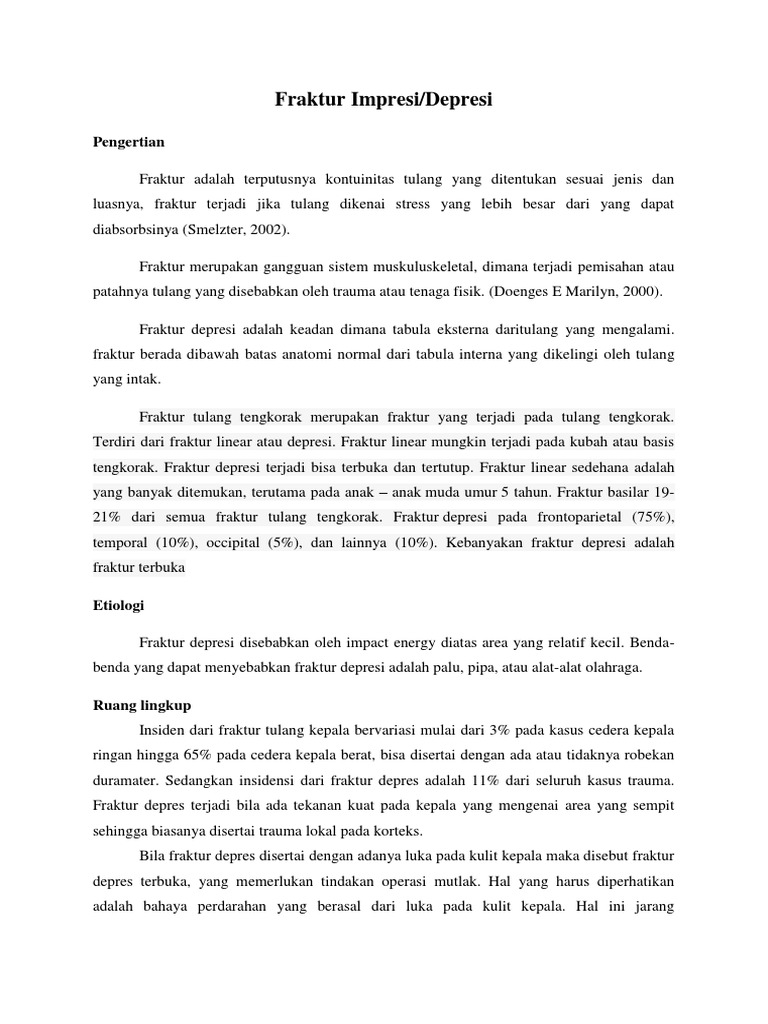Ct scan berguna untuk menentukan dalamnya depresi tulang, tapi yang lebih penting untuk menentukan ada tidaknya perdarahan depresi adalah. Fraktur tertutup atau fraktur sederhana adalah patah tulang yang tidak menyebabkan robekan pada kulit (brunner & suddarth, 2013).