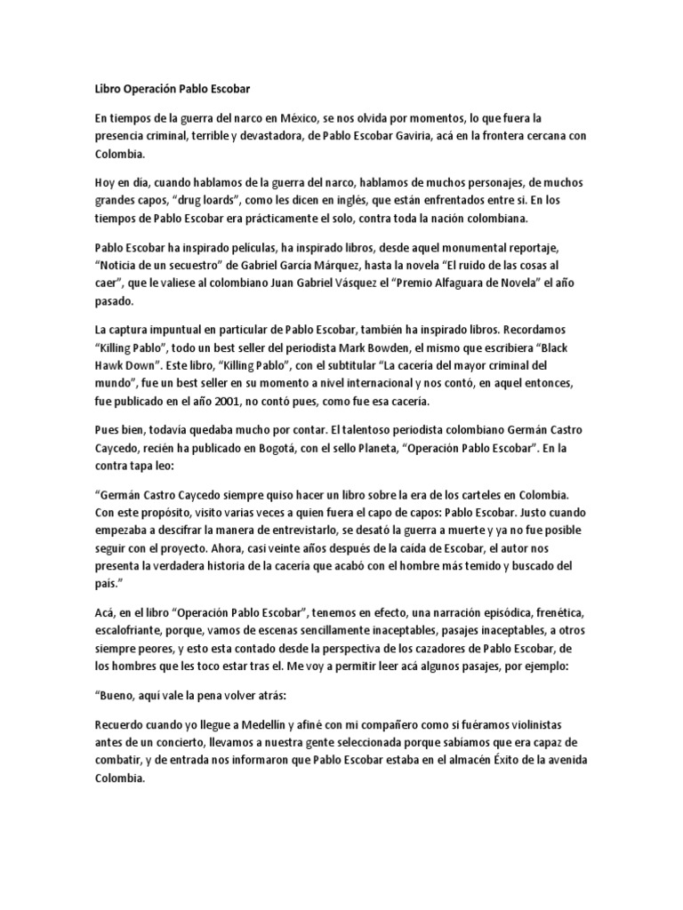 El Libro De La Semana Operacion Pablo Escobar Youtube from i.ytimg.com Jul 28, 2017 · germán castro caycedo siempre quiso hacer un libro sobre la era de los carteles en colombia. See all formats and editions. 22 hours ago · germán castro caycedo falleció este 15 de julio. Jul 28, 2017 · germán castro caycedo siempre quiso hacer un libro sobre la era de los carteles en colombia. More images for german castro caycedo y pablo escobar » Sus libros alcanzan tirajes que hoy sobrepasan un millón de libros acogidos por el público colombiano. Con este propósito, visitó varias veces a quien fuera el capo de capos: Con este propósito visité varias veces a pablo escobar.